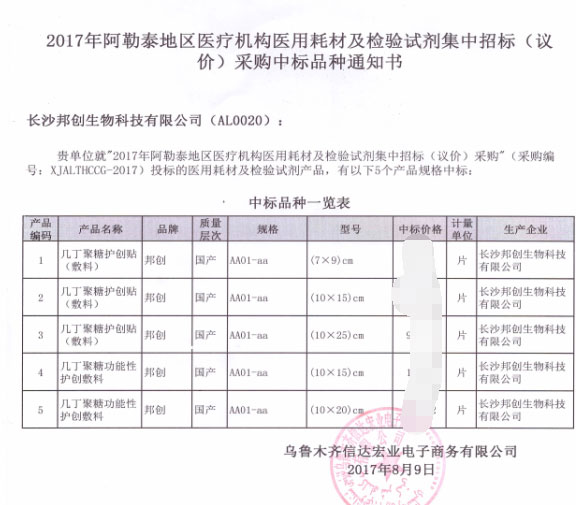 恭賀我公司產(chǎn)品在2017年新疆阿勒泰醫(yī)用耗材招標(biāo)采購項目中標(biāo)